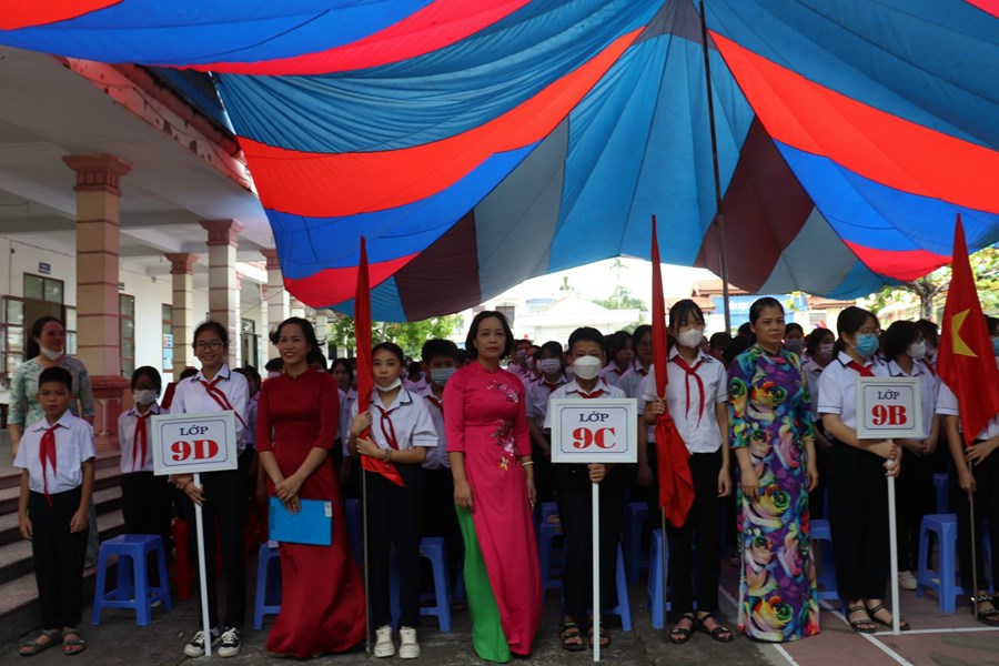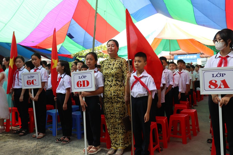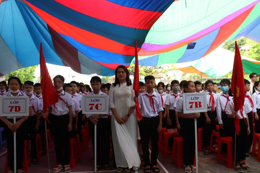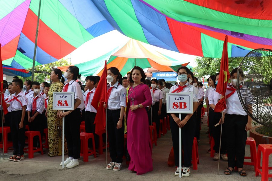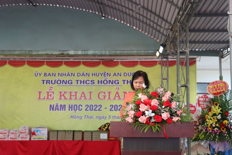 Cô Lưu Thị Hạnh - Bí thư chi bộ - Hiệu trưởng thay mặt HĐSP đọc diễn văn chào mừng nêu bật thành tích năm học 2021-2022: trường đạt 76 giải HSG cấp huyện, 4 giải HSG thành phố, 1 giải HSG quốc gia; kết quả thi vào lớp 10 quốc lập đứng thứ 4/16 trường trong huyện.